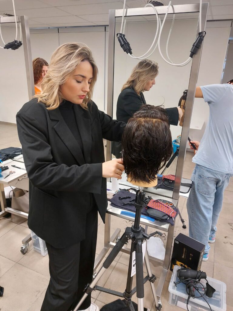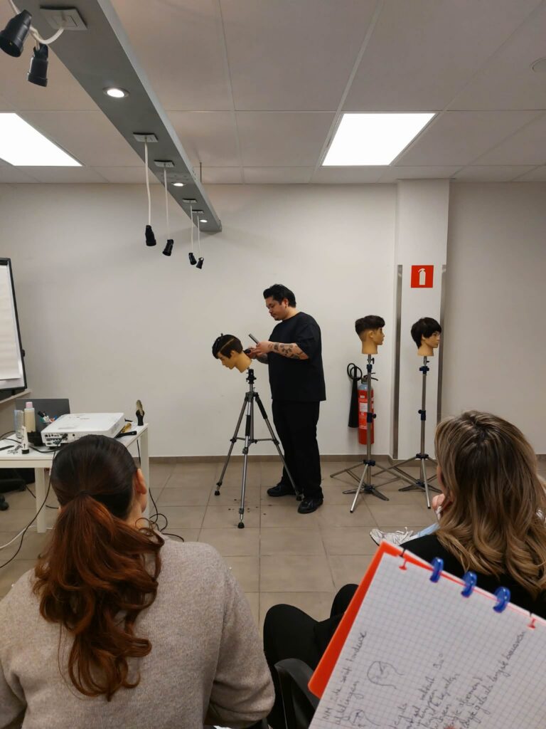 ✂️ Tijdens deze leerrijke dag stond het echte vakmanschap centraal: werken met schaar en kam in plaats van enkel de tondeuse. Met veel focus en precisie oefenden ze op moeilijke kruinen, verfijnde details en het planmatig opbouwen van een herenkapsel. In de namiddag gingen ze verder aan de slag met de tondeuse en leerden ze een strakke tapercut creëren. Daarbij kregen ze heel wat tips & tricks om de verschillende lengtes mooi in elkaar te laten overvloeien en perfecte fades te realiseren.